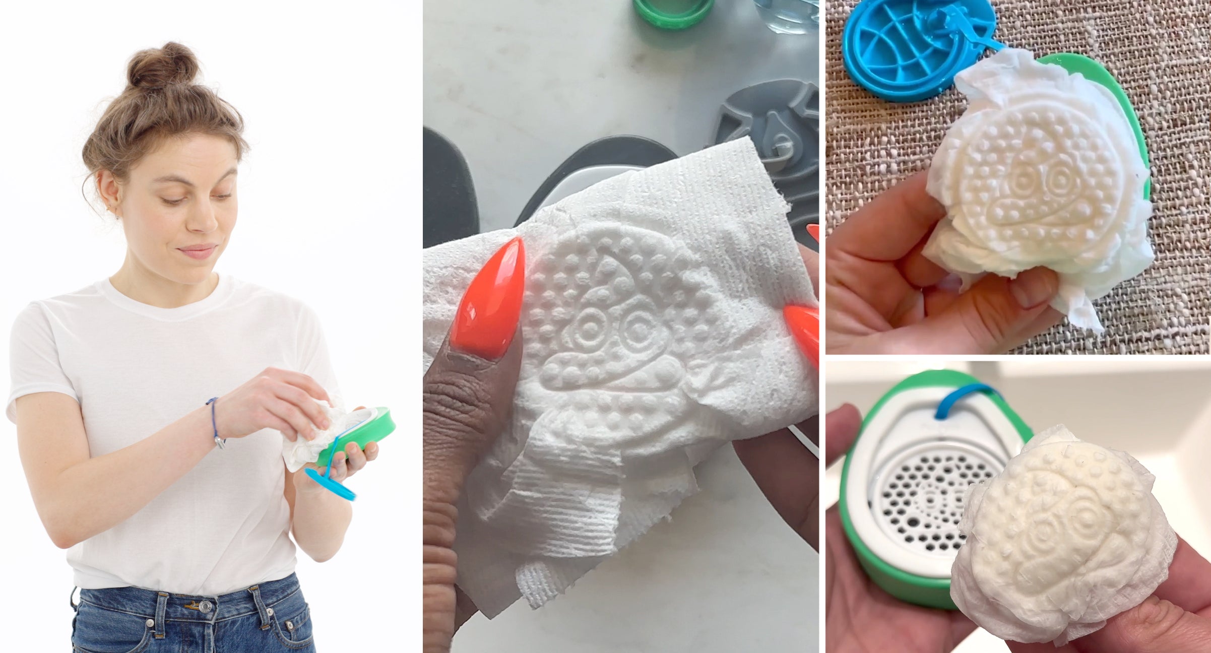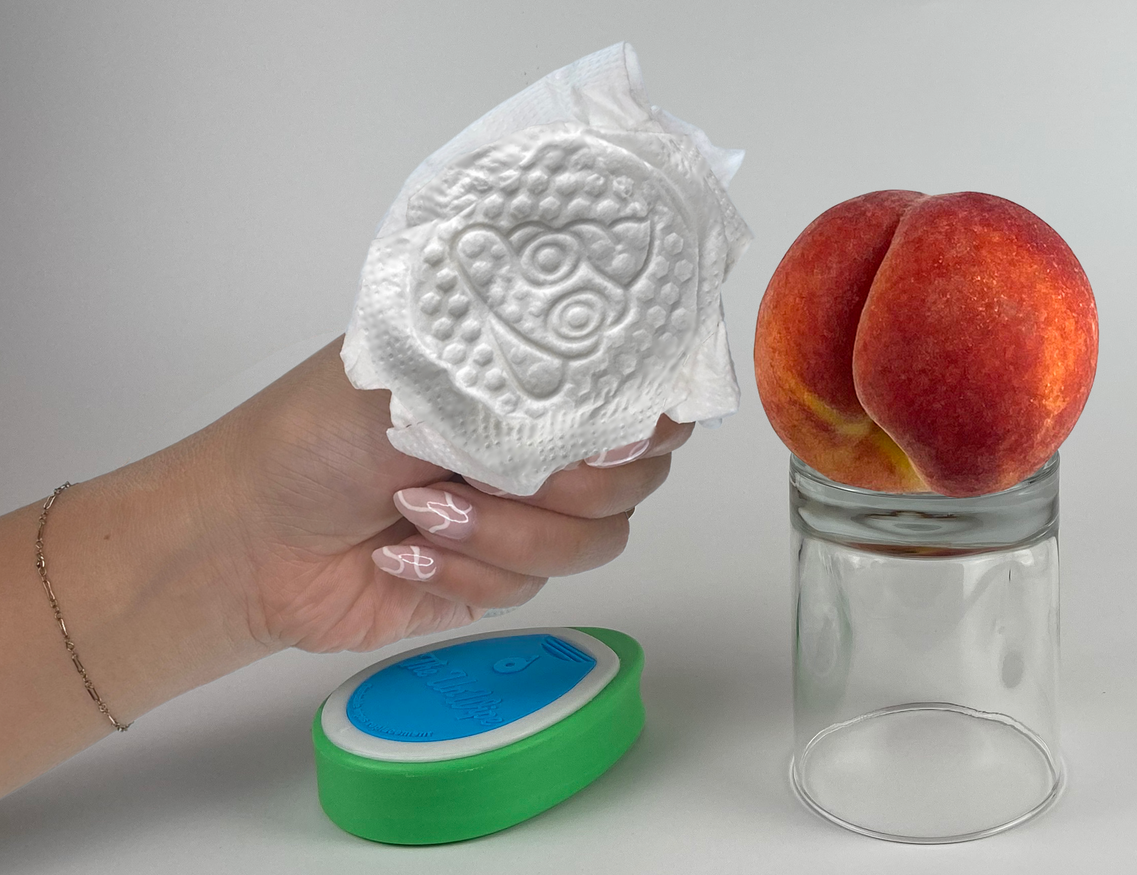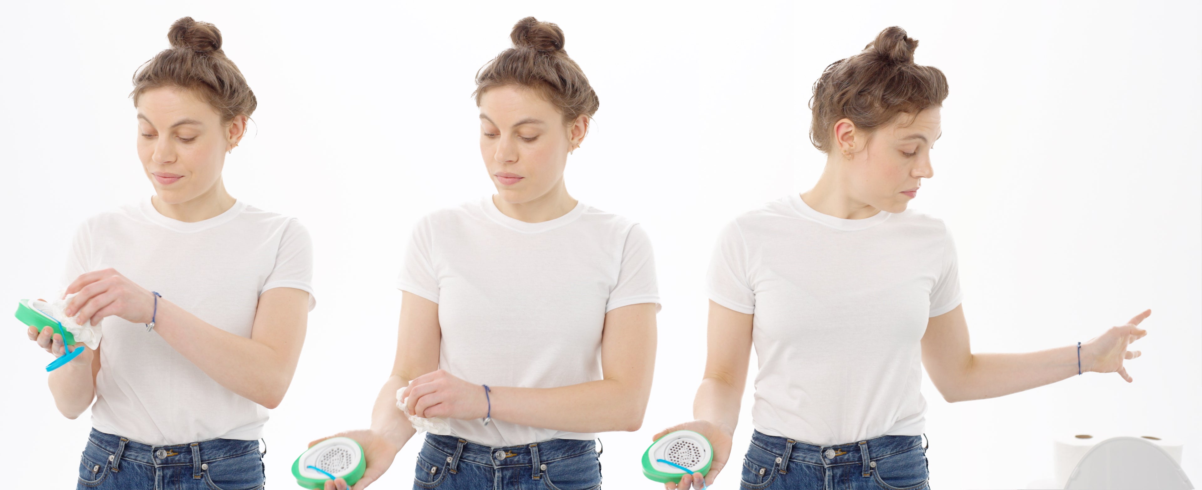 Simply press any toilet paper into the engineered mesh for ½ second, then wipe and flush like normal. Your toilet paper instantly becomes stronger and has a rich, perfectly wet texture you can see and feel that will clean your tush more completely and with no damage to pipes or planet.
