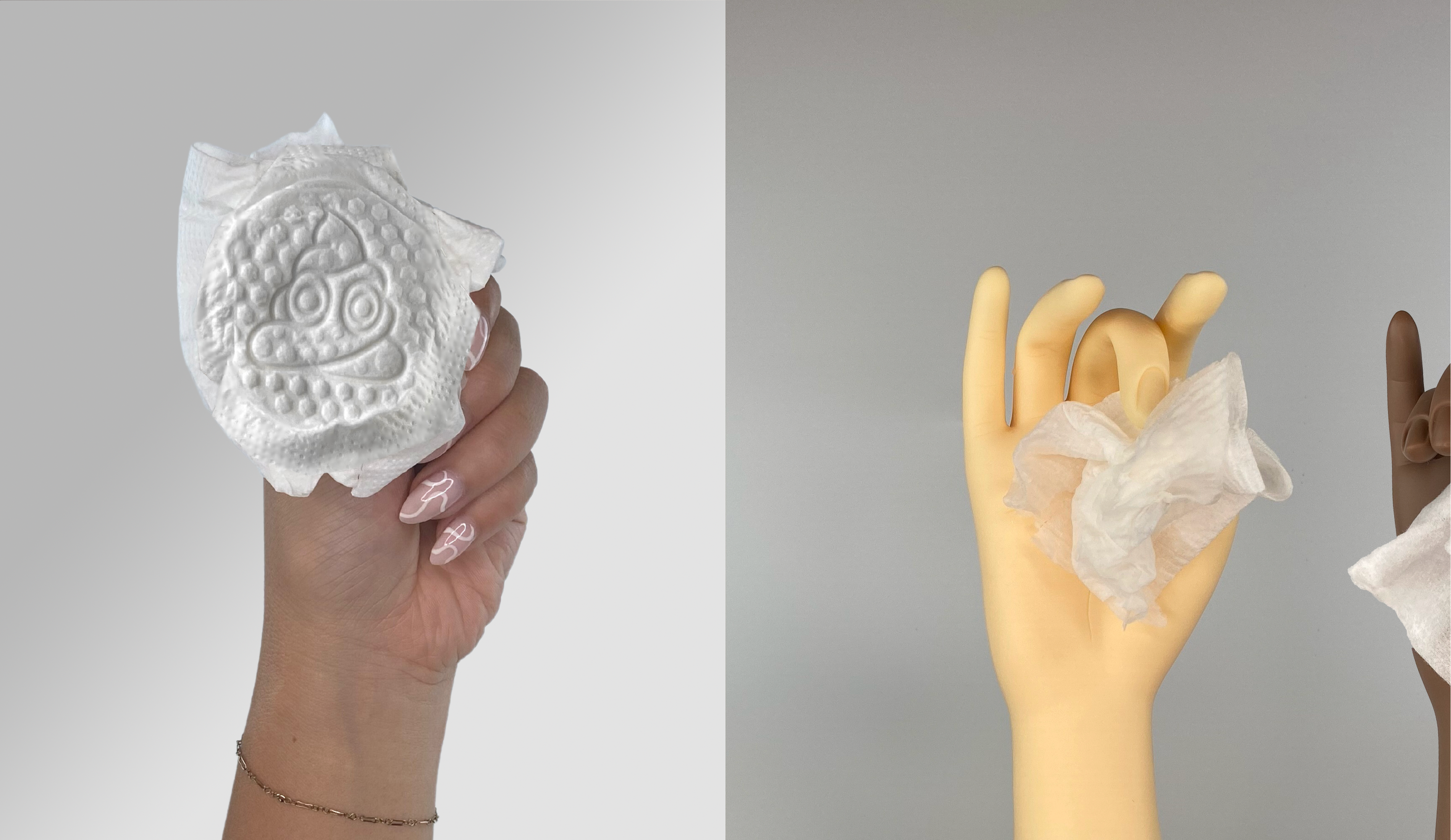 - Press four or so sheets of 🧻 into The UnWipe for about ½ second. This puts slightly wet, totally badass texture on the paper. Like Goldilocks, aim for not too wet and not too dry.